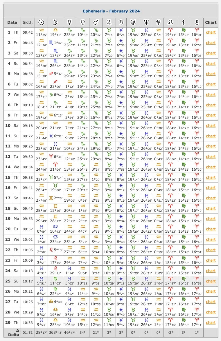 Ephemeris details February 2024. The symbols for the planets run horizontally across the top of the page, and the symbols for the signs vertically down the page.